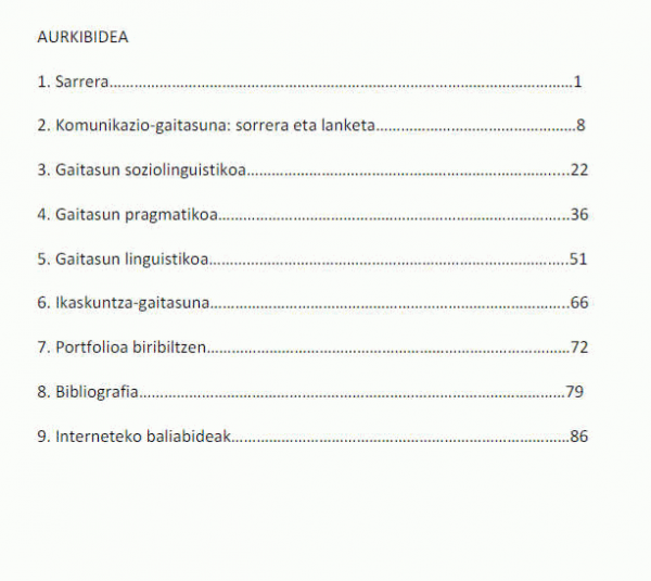 Lanaren hasieran, komunikazio gaitasuna kontzeptuaren sorreraren eta izan duen bilakaeraren berri emango da; bigarren kapitulutik laugarrenera bitartean, komunikazio gaitasuna osatzen duten azpigaitasun soziolinguistikoaren, pragmatikoaren eta linguistikoaren berri emango da, kapitulu bakoitza azpigaitasun-mota bati dagokio, eta hurrengo puntu hauek landuko dira adierazitako kapitulu horietan guztietan: Komunikazio gaitasunari egiten dion ekarpena, ikas-estrategiak lantzeko era azpigaitasunen garapen egokirako; azpigaitasunek testu jakinekin izan dezaketen lotura eta trebetasunen bidez egin daitekeen lanketa; azpigaitasun bakoitzaren autoebaluaziorako gida; eta azkenik, portfolioaren lanketarako jarduerak.