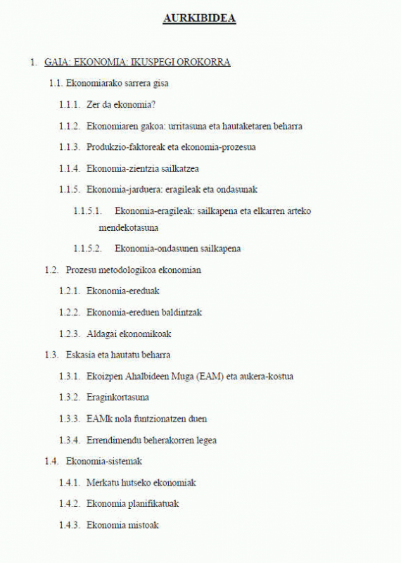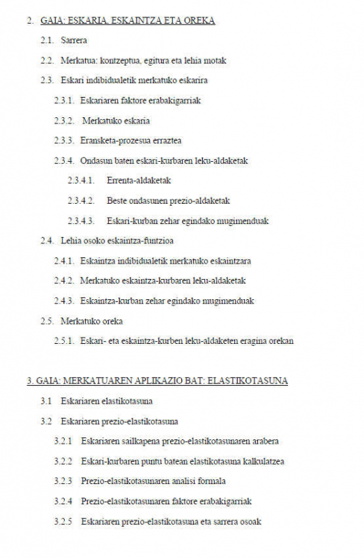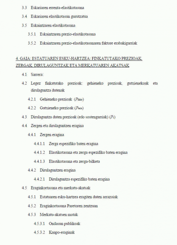 Material hau 4 gaitan banatuta dago. Lehenengo gaian ekonomiaren ikuspegi orokor bat lantzen da, ikasleek ekonomia zer den ikus dezaten. Bigarren gaiarekin merkatuaren analisia hasten da. Gai honetan eskaria, eskaintza eta oreka aztertzen dira. Hirugarren gaian elastikotasuna lantzen da, elastikotasuna hainbat aplikazio dituen kontzeptua baita. Azkenik, merkatuan sortzen diren akatsak aztertzen dira eta baita Estatuak merkatuan esku-hartzeko dituen tresna ezberdinak.