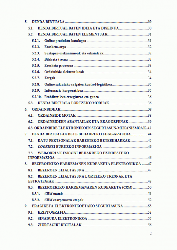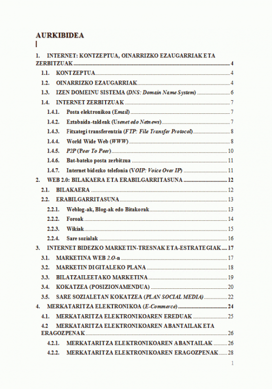 - Internet: kontzeptua, onarrizko ezaugarriak eta zerbitzuak. - Web 2.0.: bilakaera eta erabilgarritasuna. - Internet bidezko Marketing-a: tresnak eta estrategiak, Marketing Plan Digitala, Plan Social Media (sare sozialen garrantzia). - Merkataritza elektronikoa: online denda, ordainketa sistemak, horniduren banaketa-antolakuntza, legedia.