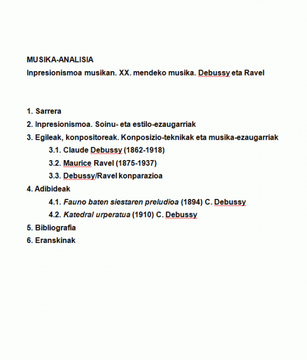 XX: mende hasieran Inpresionismo deituriko korronte estetikoa sortu zen musika, poesian eta pinturan. Musikaren soinu‐ eta estilo‐ezaugarrien bidez, Debussy eta Ravel egile nagusiak aztertuko ditugu.