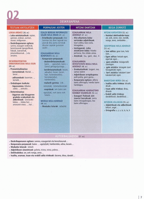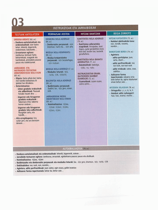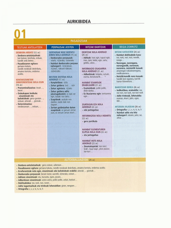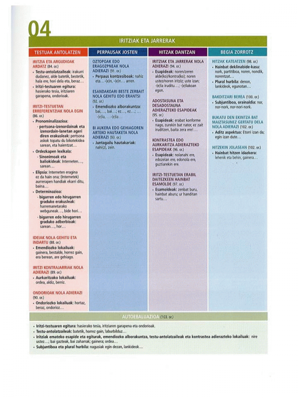 Ikaslearen liburuak bost unitate didaktiko ditu. Unitate bakoitzean hiru helburu proposatzen dira, eta helburu bakoitza ekintza komunikatibo bat da. Ekintza horietan bizitza errealeko gaiak, egoerak eta testuinguruak islatzen dira; ikasleak, jarduera komunikatiboen bitartez, hizkuntza modu naturalean erabiltzeko aukera izango du. Ezinbestekoa da testuen esanahia ulertzea ekintza zuzen eta egoki burutzeko. Entzumenean oinarritutako jarduerek berebiziko garrantzia hartzen dute. Unitate bakoitza egiteko, 25 ordu aurreikusi dira (Ikaslearen liburua + Lan-koadernoa). Dena dela, ikasle guztiek ez dituzte berdin baliatuko eskainiko zaizkien aukera guztiak, norbanakoaren beharrak eta premiak ezberdinak izango baitira uneoro. Ikaslearen liburuko erantzunak eta transkripzioak aparte eskaintzen dira (liburuaren osagarri moduan), ikasleak eskura izan ditzan. Jarduerek erantzun bat baino gehiago badute, aukera horiek ere jasota daude. Normalean, galdera itxiak proposatu dira, baina galdera irekiak dituzten jardueretan, balizko erantzunak eman dira ia beti. Ahozko testu guztien transkripzioak ere jaso dira.
