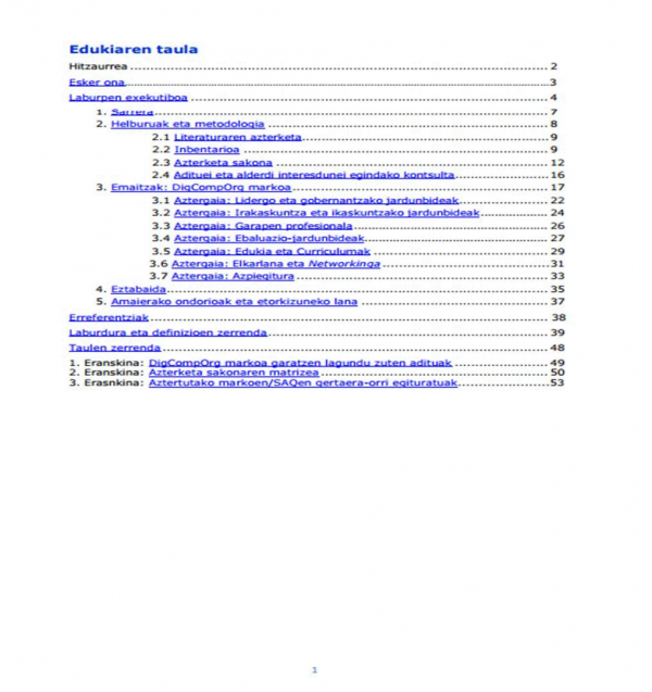 Aro digitalean ikaskuntza eraginkorra sustatzen - Europako markoa arlo digitalean gai diren hezkuntza erakundeentzat Teknologia digitalak oso modu egokian eta gogo biziz ari dira sartzen hezkuntza-maila guztietan. Aurrerapena finkatzeko eta bere segida eta jasangarritasuna ziurtatzeko, hezkuntza erakundeek berrikusi egin behar dituzte beren antolaketa estrategiak, batetik, berritzeko euren gaitasuna hobetzeko eta, bestetik, teknologien eta eduki digitalen ahalmen guztia ustiatzeko. Txosten honetan arlo digitalean gai diren erakundeentzako Europako markoa aurkezten da (DigCompOrg). Marko honek Europa osoan gai honekin lotuta abian jarri diren ekimenen gardentasuna eta euren artean konparazioak egitea ahalbidetu dezake eta, aldi berean, estatu kideetako garapen ezberdinaren eta zatiketaren tratamenduan eginkizun bat bete dezake. DigCompOrg markoaren helburu nagusiak dira: (i) hezkuntza-erakundeen baitan hausnarketa eta autoebaluazioa egin dezatela sustatzea, ikaskuntza eta pedagogia digitalekin duten inplikazioa pixkana sakontzen doazen heinean eta (ii) politikak lantzeko ardura dutenei ikaskuntza digitalerako teknologiak integratzeko eta modu eraginkorrean erabiltzeko esku-hartzeak eta politikak diseinatu, inplementatu eta ebaluatzeko aukera ematea.