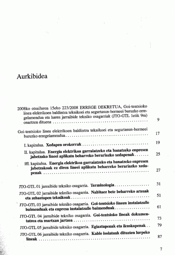 Energia-instalazioetako industria-segurtasunari buruzko arau bat da 2008ko otsailaren 15eko 223/2008 Errege Dekretua, Goi-tentsioko linea elektrikoen baldintza teknikoei eta segurtasun-bermeei buruzko erregelamendua eta haren jarraibide tekniko osagarriak (JTO-GTL 01etik 09ra) onartzen dituena.Erregelamenduaren xedea da goi-tentsioko linea elektrikoek bete beharreko baldintza teknikoak eta segurtasun-bermeak ezartzea, helburu hauek lortzeko: goi-tentsioko linea elektrikoen eraginpean egon daitezkeen pertsonak eta ondasunen osotasuna eta funtzionalitatea babestea; energia elektrikoaren hornidurak behar duen erregulartasuna lortzea; material elektrikoaren fabrikazioan dagoen tipifikazio zabala murrizteko behar diren arauak ezartzea; eta, lineen proiektu-fasetik hasita, zentzuz aurreikus daitezkeen etorkizuneko karga-handitzeetara egokitzeko aukera erraztea.Erregelamendu honetako xedapenak goi-tentsioko linea elektrikoei aplikatzen zaizkie, eta goi-tentsioko linea elektrikotzat hartzen dira 50 Hz-eko maiztasuneko korronte alterno trifasikokoak, faseen artean kilovolt batetik gorako tentsio izendatu efikaza dutenak. Energia garraiatzeko edo banatzeko beste sistema batzuk -korronte zuzena, korronte alterno monofasikoa edo polifasikoa, eta abar- erabiltzea aurreikusten den lineetan, proiektugileak berariazko justifikazioa egin beharko du, eta proposatutako sistemaren berezitasunetara egokitu beharko ditu erregelamendu honetako oinarrizko printzipioak eta aginduak.