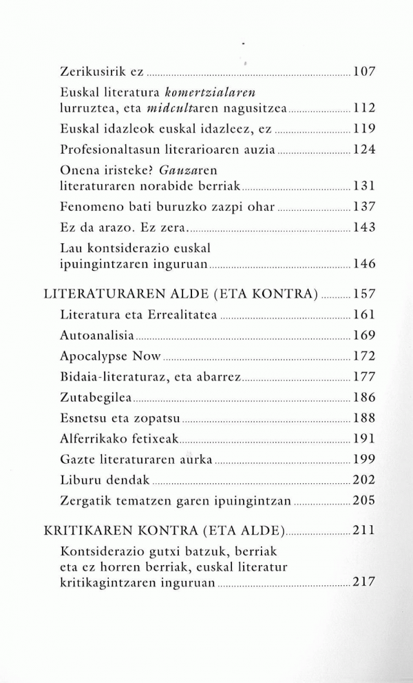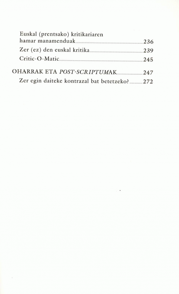 Nola bete kontrazal bat? Ohikoena, liburuaren laburpen/goraipamen bat kokatzea da. Baina sekula ez dago argi zein den testu horren benetako egilea, sinatuta ez datorren liburuko bakarra den neurrian. Printzipioz editoreak izan beharko luke sinadurarik gabeko sinatzailea, liburuaren alde eginez: lan-hau-e-zin-bes-te- koa-da, e-ros-i! Baina argitaletxe askok egileei eurei enkargatzen diete kontrazaleko testua. Gutxitan idazten dute, ordea, singularraren 1. pertsonan, fikzioari -editorialarena dela- eutsiz. Izan ere, askotan, liburuko fikziorik lortuena kontrazalekoa da. Beste aukera bat: obraren lagin bat ipintzea. Baina nola jakin aukeratutako erakuskaria benetan esanguratsua den? Edo, okerrago, zer gertatzen da liburuko gainontzeko pasarte guztien gainetik badago? Azkenik, egileak liburuaren edukiarekin lotura zuzenik ez duen testu bat propio sor dezake, hemen bezala. Nahiz eta hau ere, ahalegin guztiak egin arren, ez dugun sinatuko, eta ez dugun lortuko singularraren 1. pertsonan idaztea, kontrazalaren lege ezkutuen menpe baikaude betiere.
