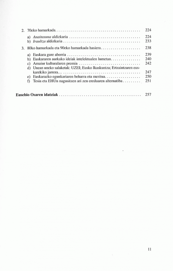 Eusebio Osaren pentsamendua jarraitu liteke liburu honetan. Borroka sozial-kulturaletan murgildu zen buru-belarri: ikastolan, alfabetatze-eskoletan, grebetan, NATOn sartzearen aurkako koordinadoran... Eta pentsamendua eta praxia, biak elikatu zituen.Marxista izan zen. Demokrazia eta sozialismoa gauza bera ziren Osarentzat -Kuba eredu on, eta Frantzia txar-, eta indarrean frankismo faxistatik demokrazia burges kapitalista autoritarioranzko trantsizioa zegoen.Pedagogiaren arloan, Freire brasildarraren zapalduen aldeko pedagogiaren zabaltzaile izan zen; talka egin zuen gaztelaniaren ordez euskara bai baina hortik aurrera aldaketarik nahi ez zutenekin, eta Olabide ikastolatik bota egin zuten. Marxistaz gain, ateoa omen zen.Sekularizazioaren arloan, figura nabarmena da. Planteamendu tradizionaletatik abiaturik, Vatikanoko II. Kontzilioaren uberan, zenbait teologo protestanteren ildotik (Bonhoeffer...), Eliza kapitalismo zapaltzailearen euskarri nagusi zen konbentzimendura heldu zen, eta, ikuskera-aldaketa horren haritik, marxismora lerratu zen. Fedea iraultzaile izan zitekeen, Eliza atzerakoi.Beti euskaltzale eta euskal idazle. Hasiera batean nahiko tradizional, euskaldun fededun, aurrerago euskara "mantxatuaren" alde, euskara bai, baina ez zapaltzaileen alde erabiltzeko. Euskararen garrantziaz gogoetan, "gure aberria da" adierazi zuen.Pentsamendu tradizionala hausten eta berria sortzen aitzindari izan ziren Krutwig, Txillardegi eta Arestiren ildoan, Txillardegirekin talkan zenbaitetan, baina haiekin eta Joxe Azurmendi adiskidearekin eta, gure pentsamendua eraberritzen belaunaldi baten lekuko abantailatuenetako bat.