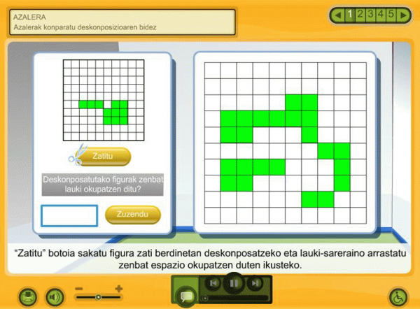 Aurretiazko ezagutza: gainazala eta azalera, forma berdinak bereiztea, zenbaketa, neurria.Helburu didaktikoak: oinarrizko matematikako elementuak erabiltzen ikastea (neurriak, zenbakiak, unitateak, sinboloak), eguneroko bizitzako egoera errealetan eta simulatuetan, eta arrazoibide-prozesuak erabiltzea, problemak ebazteko edo informazioa lortzeko. Magnitudeak zenbatzeko eta egoera errealei buruzko informazioa emateko erabiltzen diren mezuak erraztea, haurrek behar bezala interpreta ditzaten. Ikasleentzat ezagunak diren azalerak neurtzea, neurri-unitate ez-konbentzionalen bidez, kasu bakoitzean eskura duten tresnarik egokiena erabiliz eta neurketa egiteko mekanismoak ezarriz: unitatea aukeratzea, unitateen arteko erlazioak eta fidagarritasun-maila.Ezagutza mota: erazagutzailea, prozedurazkoa.
