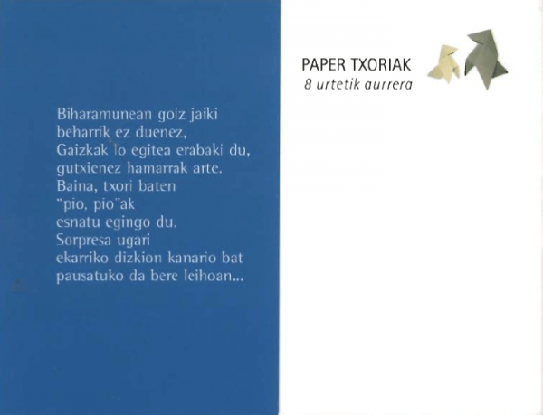 TestuaHizkuntza: Basque Original language: . spa Serie(ak): Paper txoriak. Sail urdina (Ibaizabal) ; ; 2Publication details: [Euba] : Ibaizabal, L.G. 2002Deskribapen fisikoa: 86 or. : z.-b. ir. ; 20 cmISBN: - 84-8325-659-2