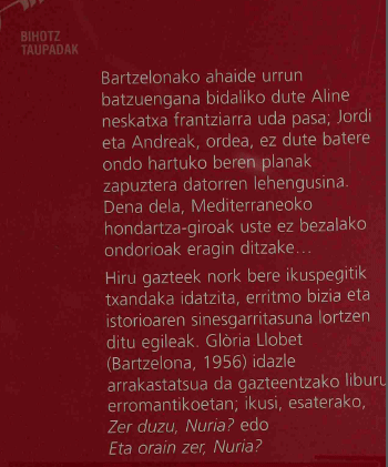 TestuaHizkuntza: Basque Original language: . cat Serie(ak): Bihotz-taupadak (Elkar) ; ; 4 | Taupadak (Elkar) ; ; 4Publication details: Donostia : Elkar, 2008Edizioa: 3. argitDeskribapen fisikoa: 155 or. ; 20 cmISBN: - 978-84-9783-101-7