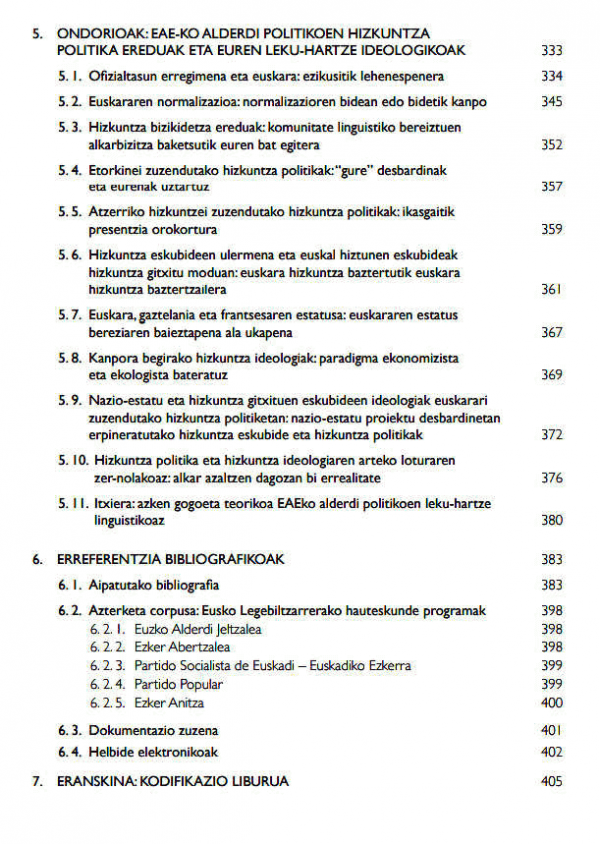 Euskal Autonomia Erkidegoko (EAE) eztabaida eta jardun politikoan euskara eta gaztelaniaren arteko bizikidetza linguistikoaren auzia bizi-bizirik dago, alderdi politikoen artean jarrera eta ikuspegi politiko-ideologiko ezbardinak agerian utziz. Eztabaida-gune zentralak bi dira: batetik, hizkuntzok gizarte mailan izan beharreko tokia eta, bestetik, berau egikaritzeko modua. Azken aldian gainera, historikoki lurraldeotan berba egin diren mintzairoz aparte eta herrialdeen arteko hartu-emanak ugaritu ahala, atzerriko hizkuntzek eurak ere goranzko presentzia bereganatu dute politikoen saio eta mintzoan; bereziki ingelesarenak, bere lingua franca estatusak bultzatuta, baina baita etorkin komunitateek ekarritako aniztasun linguistikoak ere.Plangintza linguistikoa zehaztu edota bertan eragiteko ahalmena duten eragile politikoen leku-hartze linguistikoak ezagutzeak berebiziko interesa dauka egungo eta etorkizuneko elkarbizitza linguistikoaren nondik norakoak ezagutu eta, ahal den neurrian, aurreikusteko. Ikerketa lan honetan leku-hartze horien gainean galdetu gura da; itaun zentralak honakoak izanik: zelako hizkuntza politikak hobesten dituzte EAEko alderdi politikoek? Zeintzuk ikuspuntu ideologiko agertzen dituzte hizkuntzen aurrean? Zelako lotura dago hobesten dituzten hizkuntza politika eta agertzen dituzten hizkuntza ideologien artean?