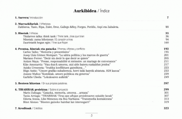 Berrogei urtez, egunik egun, hainbat egunkaritan argitaratutako binetez betea datorkigu liburu hau. Orrialdeotan, marrazkilarien eskutik, azken hamarkadetako euskal gatazka irudikatzeko askotariko ikuspegiak agertzen dira, konfrontazio politikoaren aurpegirik bortitzena agerian jarriz, sortutako sufrimendua erakutsiz eta gogoeta kritikoa bultzatuz. Bineten bidez, gatazkaren oinarriak eta ondorio gordinenak azaleratzen dira eta, aldi berean, ironiak, satirak eta parodiak gertakarietara hurbiltzeko beste ate batzuk ireki. Bakea errespetua eta elkarbizitza eraikitzeko gogoeta, begirada enpatikoa eta integratzailea lantzeko tresna egokiak izan daitezkeelako tira grafikoak.Donostia 2016 Europako Kultur Hiriburuak, EITBk eta UPV/EHUko EMAN ikerketa taldeak garatutako proiektu zabalaren baitan kokatzen da argitalpen hau. Egitasmoari TIRABIRAK izena jarri genion euskaraz, nolabait adierazteko binetek askotan egoera tenkatu egiten dutela (sokari tiratuz bezala) eta, beste batzuetan, nahiago izaten dutela lasaitze aldera jo eta arazoei umorez begiratu (bira eginez). Gaztelaniaz ere, hitz-joko bat eginez, Tiras que aflojan esamoldea erabili dugu izenburu gisa.