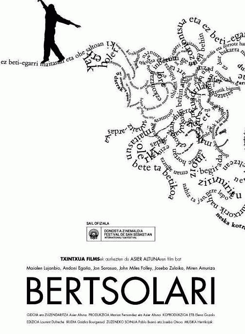 FilmPublication details: [S.l.] : Txintxua Films , L.G. 2012Deskribapen fisikoa: 1 bideodisko (DVD) (ca. 85 min) : soinuduna, kolGaia(k): Generoa/Forma:Cast:Maialen Lujanbio, Andoni Egaña, Jon Sarasua, John Miles Folley, Joseba Zulaika, Miren AmurizaAdina / Maila: Bertsolaritzak lagundu digu estimulu moduan filma sortzeko prozesuetan. Asko gozatu dugu inprobisatzen, gidoia filma egiten ahala idazten, lehenik amaiera pentsatzen -bertsolariek egiten duten bezala -, bertsoen egitura eta pelikularena alderatzen, isiluneekin eta biluztasunarekin jokatzen, bertigoarekin. Baina batez ere intuizioak gidatu gaitu. Nora iritsiko ginatekeen oso ondo jakin gabe, prozesuarekin gozatu dugu, eta bukatu dugunean izugarrizko poza sentitu dugu.