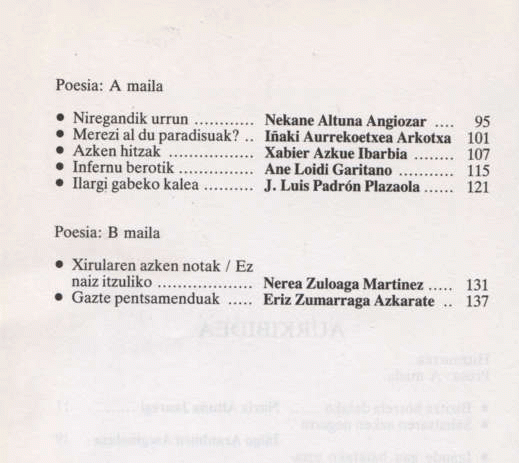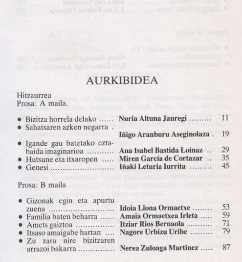 Eskuan duzun bilduma-liburuska 1987ko Urruzuno Literatur Lehiaketan irabazle atera diren lanez dago osatua, Denak ere irakaskuntza ertainetan diharduten ikasleek idatziak, horiei zuzendua baitago, bereziki, aipaturiko Literatur Lehiaketa. 1987koan 10 lan saritu dira prosan eta 7 poesiako sailean.