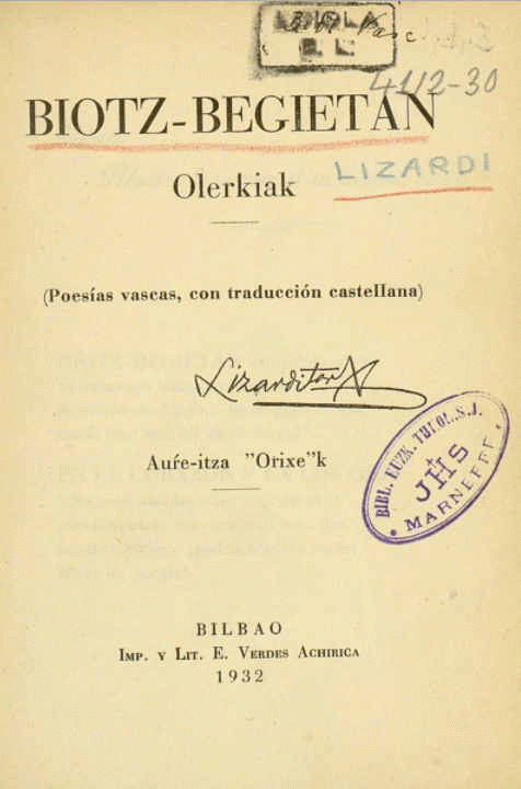 Biotz-begietan [Interneteko baliabidea] : olerkiak : (poesías vascas, con traducción castellana) / Lizarditar ; aurre-itza, "Orixe"k