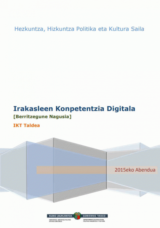 TestuaPublication details: Eusko Jaurlaritza, Hezkuntza, Hizkuntza eta Ikerketa Saila , 2015Deskribapen fisikoa: 27 or. PDFGaia(k): Generoa/Forma:Sareko errekurtsoak:Adina / Maila: DIGCOMP markoaren arabera, konpetentzia digitala bost arloetan egituratzen da (Informazioa, Komunikazioa, Edukiak sortzea, Segurtasuna, Arazoak ebaztea), guztira hogeita bat azpikonpetentzia biltzen dituelarik: bere ezagutzak, trebetasunak eta jarrerak zehaztuz. Ildo horretatik Eusko Jaurlaritzak ere abian jarri du IKANOS3 proiektua. Berorren xedea, Euskal Autonomiako herritarrei konpetentzia digitalen ahalduntze prozesuan laguntzea da eta esparru profesional guztietan langileak prestatzeko estrategiak ematea. Hala, irakasleoi ere antzeko estrategiak eskaintzea hobetsi dugu formazio ekimen honetan, esatebaterako: "autoebaluazio" baten bitartez, irakasle bakoitzak edota klaustro osoak konpetentzia digitaletan dituzten hutsuneak antzeman ditzakete, ondoren, Berritzegunearekin batera formazio ekintzak antolatu ahal izateko.