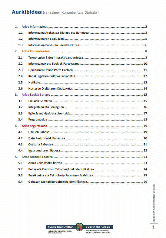 DIGCOMP markoaren arabera, konpetentzia digitala bost arloetan egituratzen da (Informazioa, Komunikazioa, Edukiak sortzea, Segurtasuna, Arazoak ebaztea), guztira hogeita bat azpikonpetentzia biltzen dituelarik: bere ezagutzak, trebetasunak eta jarrerak zehaztuz. Ildo horretatik Eusko Jaurlaritzak ere abian jarri du IKANOS3 proiektua. Berorren xedea, Euskal Autonomiako herritarrei konpetentzia digitalen ahalduntze prozesuan laguntzea da eta esparru profesional guztietan langileak prestatzeko estrategiak ematea. Hala, irakasleoi ere antzeko estrategiak eskaintzea hobetsi dugu formazio ekimen honetan, esatebaterako: "autoebaluazio" baten bitartez, irakasle bakoitzak edota klaustro osoak konpetentzia digitaletan dituzten hutsuneak antzeman ditzakete, ondoren, Berritzegunearekin batera formazio ekintzak antolatu ahal izateko.