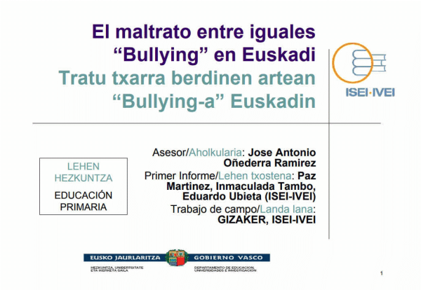 Tratu txarra berdinen artean [Interneteko balibidea] : bullying-a Euskadin : Lehen Hezkuntza / [aholkularia, Jose Antonio Oñederra Ramirez; lehen txostena, Paz Martinez, Eduardo Ubieta (ISEI-IVEI) ; landa lana, Gizaker, ISEI-IVEI