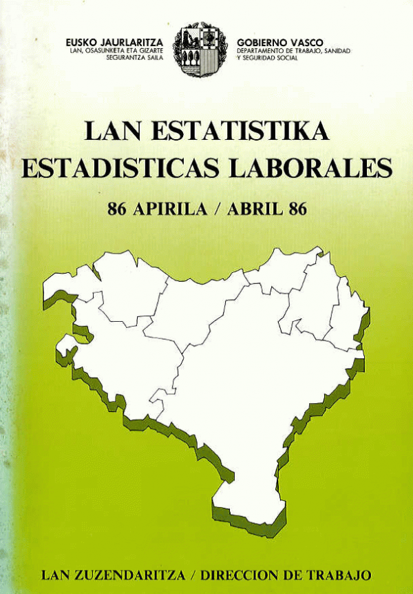 Lan estatistiken buletina = Boletín de estadisticas laborales / Eusko Jaurlaritza, Lan eta Gizarte Segurantza Saila, Lan Zuzendaritza = Estadísticas laborales / Gobierno Vasco, Departamento de Trabajo y Seguridad Social, Dirección de Trabajo 86 apirila / abril 86