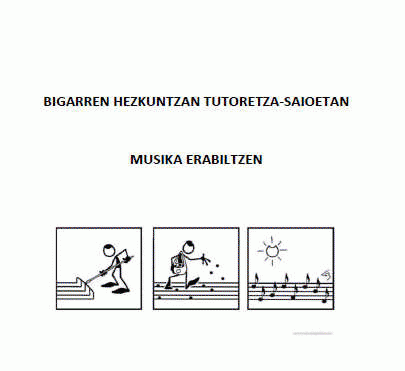 Esku artean duzun lan honek musikan oinarritutako hainbat jarduera proposatzen ditu oinarrizko zehar-konpetentziak lantzeko Bigarren Hezkuntzako tutoretza-saioetan.Ikasleek askotan eskatzen dute musika entzutea tutoretza-saioetan. Ikasleen eskaera hori aprobetxatu nahi da, saio horietan landu beharreko eduki batzuk musikaren bitartez lantzeko. Izan ere, musikak ikasle guztiei ematen dienez aukera jardueretan arrakastaz parte hartzeko, ikasle nerabeen autoestimua eta taldeko harremanak hobetu ditzake. Eta horiek dira, hain zuzen ere, tutoretza-saioetan landu beharreko edukietako batzuk.Lan honek bi zati nagusi ditu. Lehenengo zatian, proposamenaren oinarri teorikoa azaltzen da, lau ataletan: Ikasle nerabeekin lanean; Musika, gure kulturaren zutabea; Tutoretza, oinarrizko zehar-konpetentziak lantzeko esparru aproposa, eta Musikan oinarritutako tutoretza-saioak. Bigarren zatian datoz tutoretza-saioetan erabiltzeko proposatutako zortzi jarduerak.