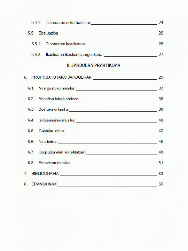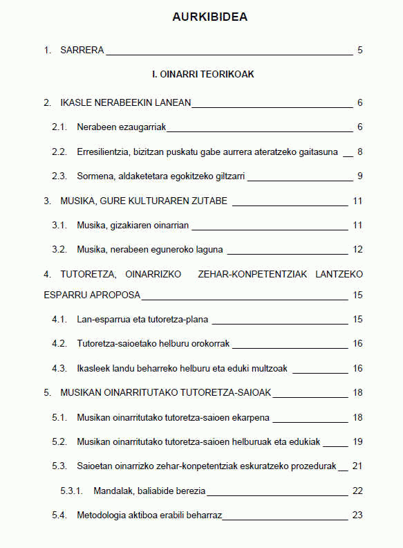 Adina / Maila: Esku artean duzun lan honek musikan oinarritutako hainbat jarduera proposatzen ditu oinarrizko zehar-konpetentziak lantzeko Bigarren Hezkuntzako tutoretza-saioetan.Ikasleek askotan eskatzen dute musika entzutea tutoretza-saioetan. Ikasleen eskaera hori aprobetxatu nahi da, saio horietan landu beharreko eduki batzuk musikaren bitartez lantzeko. Izan ere, musikak ikasle guztiei ematen dienez aukera jardueretan arrakastaz parte hartzeko, ikasle nerabeen autoestimua eta taldeko harremanak hobetu ditzake. Eta horiek dira, hain zuzen ere, tutoretza-saioetan landu beharreko edukietako batzuk.Lan honek bi zati nagusi ditu. Lehenengo zatian, proposamenaren oinarri teorikoa azaltzen da, lau ataletan: Ikasle nerabeekin lanean; Musika, gure kulturaren zutabea; Tutoretza, oinarrizko zehar-konpetentziak lantzeko esparru aproposa, eta Musikan oinarritutako tutoretza-saioak. Bigarren zatian datoz tutoretza-saioetan erabiltzeko proposatutako zortzi jarduerak.