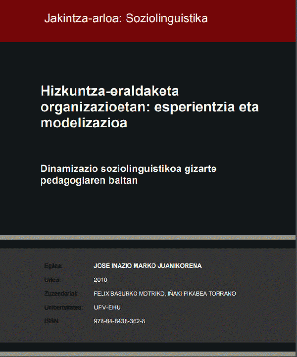 Hizkuntza-eraldaketa organizazioetan : esperientzia eta modelizazioa : dinamizazio soziolinguistikoa Gizarte Pedagogiaren baitan [Interneteko baliabidea] / J. Inazio Marko Juanikorena ; zuzendariak, Felix Basurko Motriko, Iñaki Pikabea Torrano