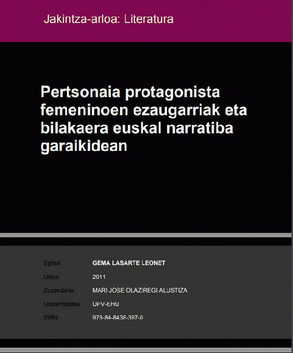 Pertsonaia protagonista femeninoen ezaugarriak eta bilakaera euskal narratiba garaikidean [Interneteko baliabidea] : euskara-gaztelania elebitasunaren azterketa : ahozko ipuinen analisi diskurtsiboa eta didaktikoa : Europako doktorego tesia / Maria Gema Lasarte Leonet ; zuzendaria, Maria Jose Olaziregi Alustiza