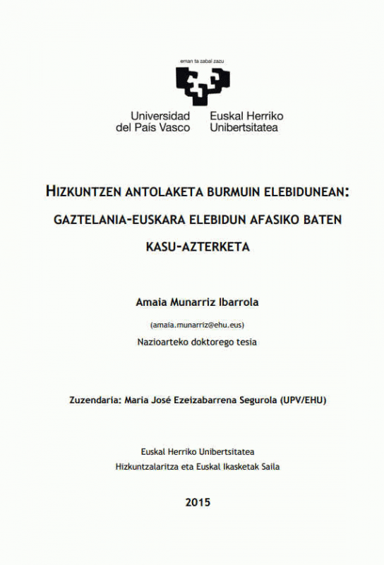 Hizkuntzen antolaketa burmuin elebidunean : gaztelania-euskara elebidun afasiko baten kasu-azterketa [Interneteko baliabidea] / Amaia Munarriz Ibarrola ; zuzendaria, Maria José Ezeizabarrena Segurola