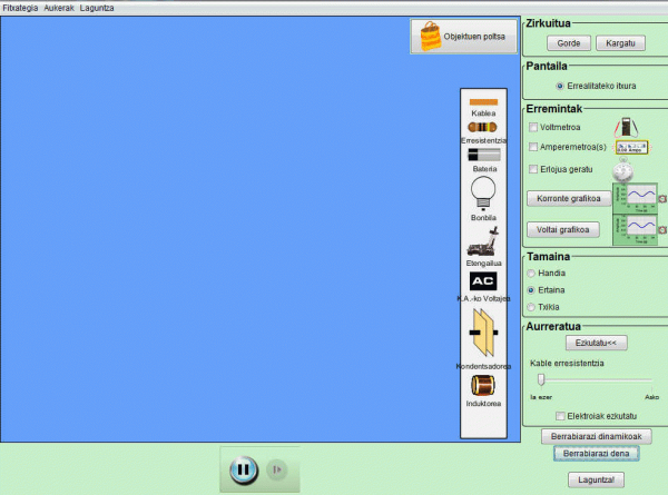 Zirkuituak, bonbillak, bateriak, etengailuak, amperimetroa, voltmetroa, kapazitorea,induktorea, AC boltaia lantzeko simulazio interaktiboa