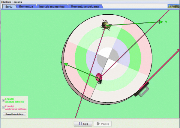 Biraketa, bihurdura-esfortzua, inertzia-momentua, momentu angeluarra lantzeko simulazio interaktiboa.