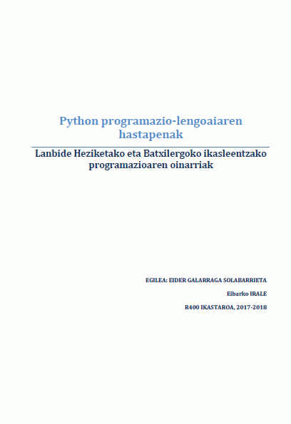 Python programazio-lengoaiaren hastapenak [Interneteko baliabidea] : Lanbide Heziketako eta Batxilergoko ikasleentzako programazioaren oinarriak / egilea, Eider Galarraga ; zuzentzailea, Ane Sarasketa
