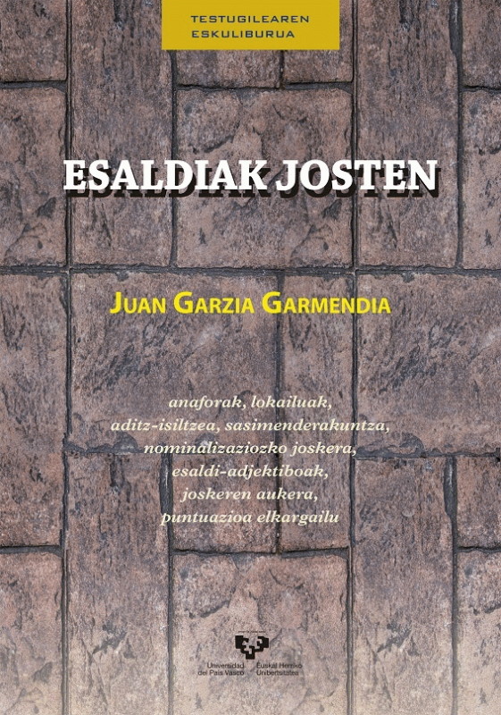 Esaldiak josten hau Esaldiaren antolaera: funtzio-informatiboak gako liburukiaren segida da, Testugilearen Eskuliburua egitasmoa osatzeko bidean. Esaldiaren esparruan aritu ginen han, eta egokia zen hortik abiatzea, esaldia izanik diskurtsoaren unitate oinarrizkoa. Oraingo honetan, hortik aurrerako -hortik gorako- urratsari ekingo diogu: ea esaldiak diren unitate prosodiko, sintaktiko eta semantiko nagusi horiek nola konbinatzen diren testua osatuz joateko, hots, nola josten den esaldiz esaldi diskurtsoaren haria, hala unitate zabalago batzuk eraturik: esaldi-elkarketa, esaldi-katea, paragrafoa. Esaldiak elkarrekin lotzeko oinarrizko prozedura elkarketa da, bere bi aukeretan: juntadura (juntagailua tartean) eta alborakuntza (juntagailurik gabe). Lehenik, elkarketa den joskera-ildo nagusi horretan baliatzen diren josgailu funtsezko batzuk ekarriko ditugu hizpidera: anafora-sistema eta lokailuak. Badira, haatik, eraldakuntza batzuk elkarketaren mekanismo garbia lausotzen dutenak, eta arreta berezia jarriko diegu halakoei, hots, oinarrian (esaldia elkargailua esaldia) egituraz adieraztekoa dena bestelako itxuraz emana datorren kasuei, arruntenetatik hasi (aditza isildutako perpausen aukera), prozedura estilistiko berezietatik segi (elkarketaren ordezko sasimenderakuntza) eta erabilera bihurrienetaraino (esaldi-balioko adjektiboak, perpausezko adierazpidetik nominalizaziozkora aldatzea).