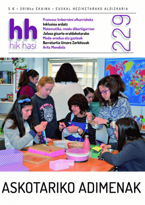 -Editoriala: Erronka berriak ezin dira soluzio zaharrekin konpondu -Albisteak. -Gai nagusia: Askotariko adimenak -Elkarrizketa, Francesc Imbernon "Isolatutako irakasleak ez du funtzionatzen. Talde-lana nahitaezkoa da. Hil da irakaslea; gora irakasle-taldea" -Ekarpenak 1:Gaixotasun arraroak dituzten ikasleen inklusioa ardatz -Ekarpenak 2: Matematika irakasteko modu dibertigarri bat -Ekarpenak 3: Zer-nolako erabilera du jolasak gizartea eraldatzeko? -Galdeidazu,Maddalen Aduriz: Nola eragiten du egungo moda-ereduak gazteengan? -Argitalpenak -Proposamena: Barretartia Umore Zerbitzuak -Atzeko atetik: Aritz Mendiola