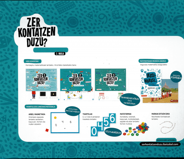 Ibaizabaleko Haur Hezkuntzako Zer kontatzen duzu? proiektu berriak Matematika manipulatiboa gerturatzen dizu. Honako hauek dira proiektuaren ezaugarrietako batzuk: -Ikaslearentzako materiala: karpeta eroso bat; 3 koaderno, hiruhileko bakoitzeko bana; matematikako irudien liburua; eta manipulazio materiala ikasketa dinamizatzeko, jolas magnetikoa, testura duten zenbakiak, mateformak; eta markak dituen soka. -Ikasgelarako materiala: manipulazio materiala duen edukiontzia: jolas magnetikoa; mateformak, markak dituen soka; testura duten zenbakiak; erregeletak; probabilitate jolasa; grafia numerikoko laminak; 1etik 100era arteko koadrantea; zuzen numerikoa; adimeneko bitak.