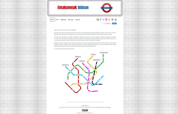 Ongi etorri "Emakumeak bidean" ikasmaterialera! Humanitatearen historia emakumeen historia ere bada, nahiz eta emakumeek egindako ekarpena isila izan den orain arte eta, kasu batzuetan, baita ezkutatua ere. Ibilbide luzea egin du gure gizarteak emakumeek egindako lanari balioa ematera iritsi arte. Historian zehar emakumeek oinarrizko eskubideen urraketa sufritu behar izan dute: jabetza, heziketa, bozkatzeko eskubiderik ez... Dena den, beti egon dira emakume adoretsuak, jakintza-arlo ugaritan bide berriak zabaldu dituztenak: politikan parte-hartu dutenak, artean gailendu direnak, hezkuntza berritu eta bultzatu dutenak, zientzialari aurreratuak... Webgune honetan, zenbait euskal emakumek irekitako bideen berri emango dizugu; bertan duzun metro-mapa honetan hainbat jakintza-arlo islatzen dituzten metro-lineak aurkituko dituzu: bertako geltokietan geratuz gero, euskal emakume adoretsu baten biografia laburra aurkituko duzu eta baita bere ibilbidea ulertzeko hainbat baliabide ere. Has zaitez emakumeen metroan bidaiatzen!