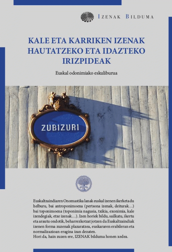 Kale eta karriken izenak hautatzeko eta idazteko irizpideak : euskal odonimiako eskuliburua [=Criterios para la denominación de vías públicas y su escritura en euskera : manual de odonimia = Critères de détermination et de graphie des noms de voies publiques : manuel d'odonymie / Onomastika Batzordea ; testu-prestatzailea, Alfontso Mujika ; gaztelaniazko itzulpenak, Manu Gañan ; frantseseko itzulpenak, Nahia Zubeldia]