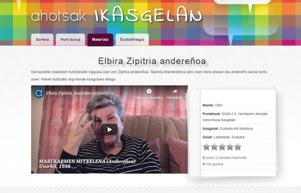 Herritarren ahotsak - Transmisioa ikasgelan : Elbira Zipitria [Bideoa - Interneteko baliabidea] / edukien diseinua eta garapena, Idoia Etxeberria; aholkularitza pedagogikoa, Aintzane Agirrebeña; ikus-entzunezkoen edizioa, Haizea Odria Esnal; edukien diseinua, Irati Lizeaga; aholkularitza pedagogikoa, Josune Zabala