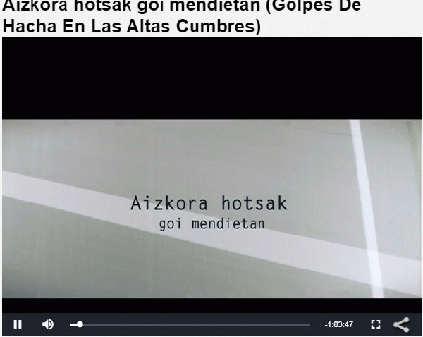 Aizkora hotsak goi mendietan [Interneteko baliabidea - Bideoa] / zuzendaritza, Eukeni Arriortua, Carlos Iglesias ; gidoilaria, Calos Iglesias ; errealizazioa, Eukeni Arriortua, Xabier Zabala A. ; produktore eragilea, Carlos Iglesias ; produkzio laguntzailea, Alex Txikon ; mendiko irudiak, Alex Txikon ; argazki-zuzendaritza, Eukeni Arriortua, David Maeztu ; ekoiztetxea, Bideografik SL