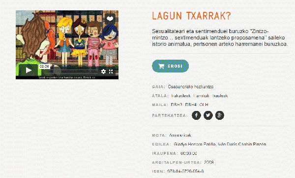 FilmHizkuntza: baq Serie(ak): Zintzo mintzo... sextimenduak lantzeko proposamenaPublication details: Bilbo : Edex, 2009Deskribapen fisikoa: Bideoak (mp3) ; 3 minISBN: - 978-84-9726-554-6