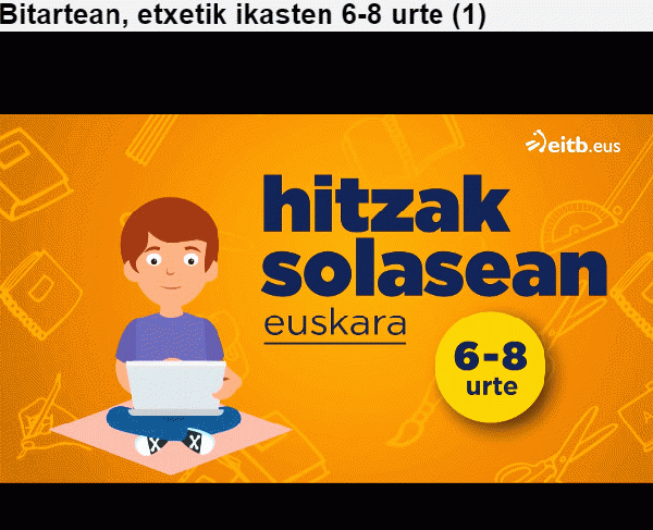 Bitartean etxetik ikasten : Testuaren ulermena eta ahoskera trebatzen : hitzak solasean: euskara [6-8 urte] / aurkezlea, Miren Igone Abio Zapirain; ekoizlea, EITB [Interneteko baliabidea - Bideoa] : 2020ko martxoak 30