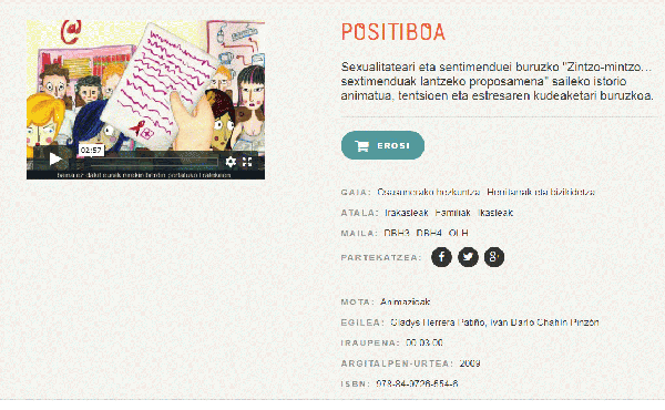 FilmHizkuntza: baq Serie(ak): Zintzo mintzo... sextimenduak lantzeko proposamenaPublication details: Bilbo : Edex, 2009Deskribapen fisikoa: Bideoak (mp3) ; 2,56 minISBN: - 978-84-9726-554-6