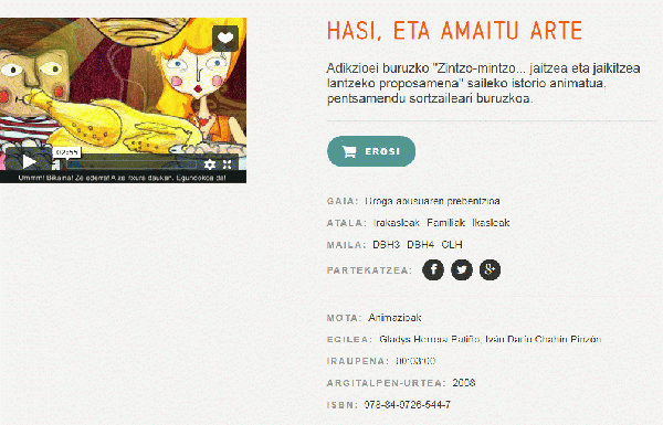 FilmHizkuntza: baq Serie(ak): Zintzo mintzo...jaitzea eta jaikitzea lantzeko proposamenaPublication details: Bilbo : Edex, 2008Deskribapen fisikoa: Bideoak (mp3) ; 2,54 minISBN: - 978-84-9726-544-7