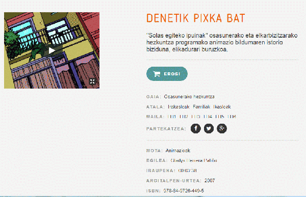 FilmHizkuntza: baq Serie(ak): Solas egiteko ipuinakPublication details: Bilbo : Edex, 2009Deskribapen fisikoa: Bideoak (mp3) ; 3:38 minISBN: - 978-84-9726-449-5