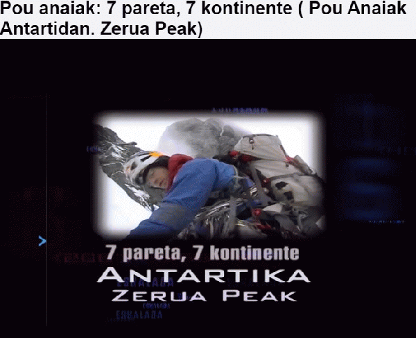 Antartika [Interneteko baliabidea - Bideoa] : Zerua Peak / zuzendaria, Jabier Baraiazarra ; errealizadorea, Zaloa Borda Kaiero ; produkzioa, Maite Laskurain ; erredakzioa eta lokuzioa, Anartz Agirre