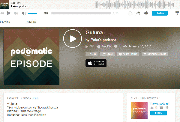 SoinuaHizkuntza: Basque Serie(ak): Literatur printzak hitz lauz (Pako Eizagirre)Publication details: [S.l.] : [s.n.], 2012Deskribapen fisikoa: Audioa (mp3) (4 min) : soinudunaGaia(k): Generoa/Forma:Sareko errekurtsoak:Adina / Maila: Pako Eizagirrek kudeatutako webgune honetan, "literatur printzak" entzun ahalko dira. Podcast laburrak dira euskal idazle ezagunen testuekin: egunkarietako artikuluak, liburuetako pasarteak...