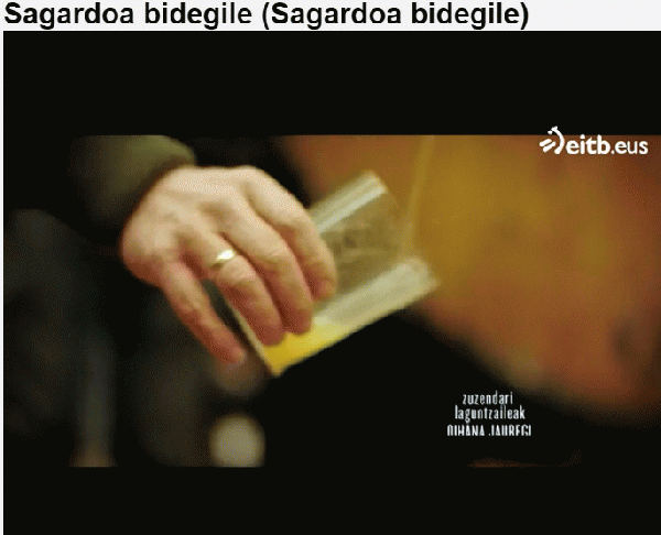 Sagardoa bidegile [Interneteko baliabidea - Bideoa] / zuzendari eta gidoilaria, Bego Zubia Gallastegi ; zuzendari laguntzaileak, Oihana Jauregi, Beñat Kortabarria ; ekoizleak, Pixel, Elhuyar ; ekoizle elkartua ETB