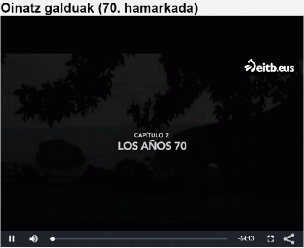 FilmSerie(ak): Oinatz galduak (EITB) ; ; 2Publication details: [S.l.] : Filmak Media : EITB, 2016Deskribapen fisikoa: Baliabide elektronikoa (55 min) : soinuduna, kolBeste izenburu bat: - Hirurogeitahamargarren hamarkada