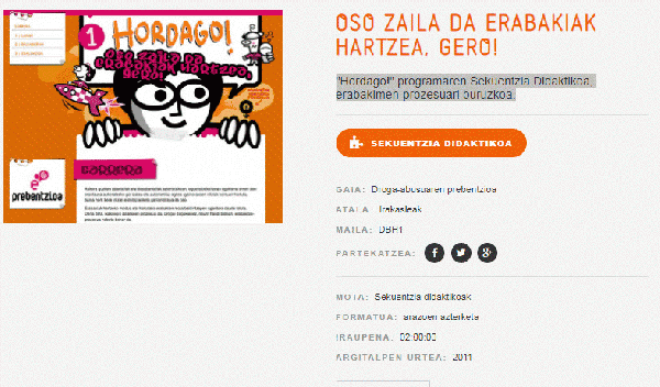 Fitxategi elektronikoaSerie(ak): Hordago! programaPublication details: Bilbo : EDEX , 2011Deskribapen fisikoa: WebguneaGaia(k): Generoa/Forma:Sareko errekurtsoak:Adina / Maila: "Hordago!" programaren Sekuentzia Didaktikoa, erabakimen-prozesuari buruzkoa.Aukera guztien abantailak eta desabantailak aztertutakoan, egoera bakoitzean egokiena omen den erantzuna aukeratzeko gai izatea eta autonomiaz egitea (gainerakoen iritziak kontuan hartuta, baina nork bere iritziei eutsita) ariketa garrantzitsua da oso.Erabakiak hartzeko modua eta hartutako erabakien mota baldintzapen ugaritara daude lotuta. Dena dela, ikasi egin daitekeen prozesua da. Drogei dagokienez, neurri handi batean, erabakitze-prozesua hobetu behar da.
