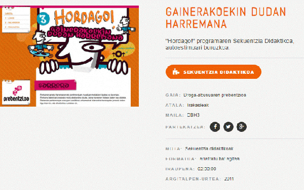 Fitxategi elektronikoaSerie(ak): Hordago! programaPublication details: Bilbo : EDEX , 2011Deskribapen fisikoa: WebguneaGaia(k): Generoa/Forma:Sareko errekurtsoak:Adina / Maila: "Hordago!" programaren Sekuentzia Didaktikoa, autoestimuari buruzkoa.Pertsonen arteko harremanen eta sentimenduen munduan moldatzen ikastea ez da erraza. Pertsona bakoitzak jokatzeko modu desberdina dauka, baina harreman hobeak izaten ikas daiteke. Gainerako pertsonengan ezaugarri positiboak antzemateak tolerantzia handiagoko jarrerak izaten laguntzen du, eta elkarbizitza sustatzen du.