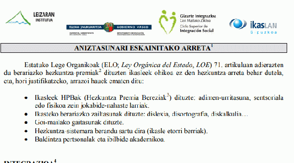 Eskoletan, hezkuntza-sistemak aniztasunari eskaintzen dion arreta, eta, horretarako hezkuntzak duen antolamendua eta baliabideak azaltzen dira dokumentu honetan. Sortze-lana da.
