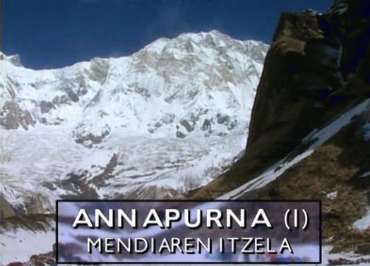 Annapurna (I) [Interneteko baliabidea - Bideoa] : mendiaren itzela / zuzendaria, Alberto Iñurrategi ; gidoia, Andoni Egaña ; kamerariak, Iñaki Edroso, Alberto Iñurrategi, Jon Beloki ; errealizazioa, Aitor Gisasola ; esataria, Joxe Manuel Goikoetxea ; Iñurrategi Anaiak SL eta ETBk eginiko programa ; ETBko produkzio ordezkaria, Susana Guridi