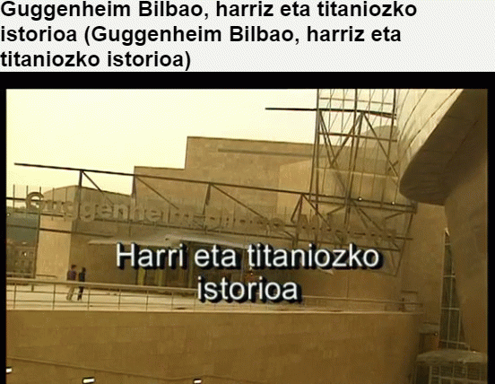Guggenheim [Interneteko baliabidea - Bideoa] : harriz eta titaniozko istorioa / gidoia eta zuzendaritza, Iñaki Bizkarra ; argazkiak, Gotzon Arribas, Javier Esparza ; produkzio laguntzailea, Maite Taranco ; produkzio eragilea, Iñaki Bizkarra ; ETB produkzio ordezkaria, Santi Uriarte